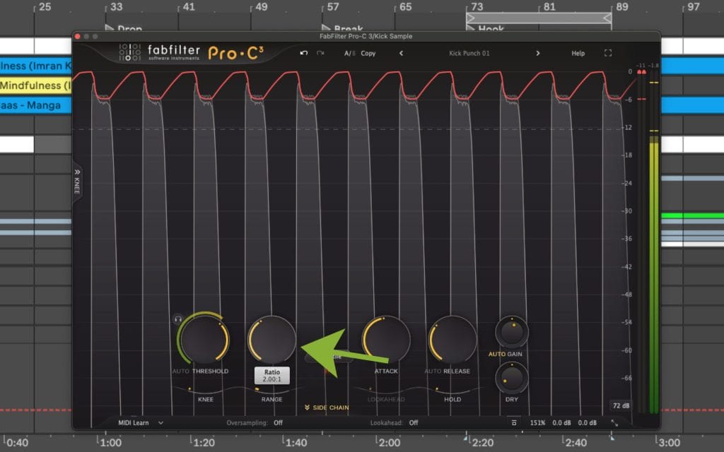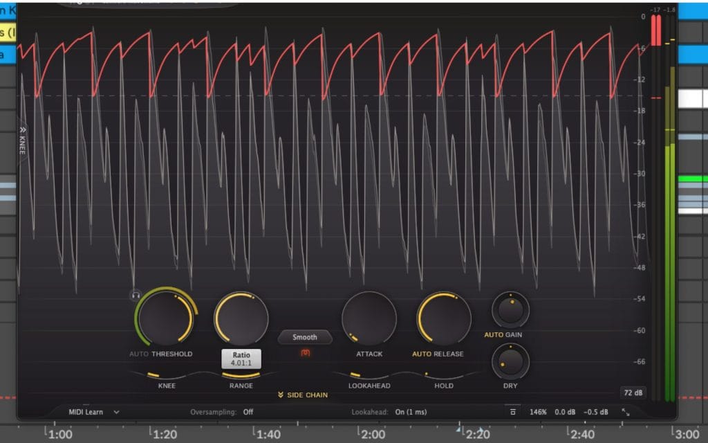 If the ratio feels unresponsive and the threshold crossing looks obvious, I also check for a Range or Max Gain Reduction cap. A cap can override the ratio setting by limiting attenuation before ratio changes can show up.