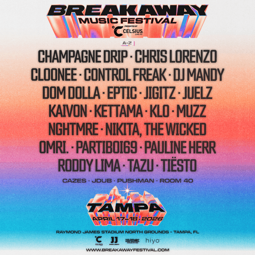 Breakaway Tampa will bring an explosive mix of sounds to Raymond James Stadium this April. Dom Dolla will deliver his signature house grooves, while Tiësto will light up the stage with legendary energy. Cloonee and Chris Lorenzo will keep the beats rolling with deep, driving rhythms. Kettama will bring raw club power, and Partiboi69 will turn the vibe unpredictable and fun. NGHTMRE, Juelz, and Eptic will push bass to the limit, while Champagne Drip and Kaivon will add melodic depth. Pauline Herr will bring emotion and edge, and Muzz will fire up drum and bass fans. Control Freak, DJ Mandy, Klo, Omri, Nikita, The Wicked, Jigitz, Roddy Lima, and Tazu will round out the lineup with genre-bending sets. Local talent will shine too—CAZES, JDub, Pushman, and Room 40 will represent Tampa’s scene. Expect house, techno, bass, and everything in between. April will sound massive.