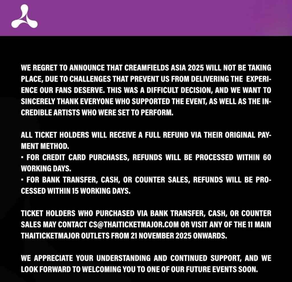 Creamfields in Asia dream is officially over, albeit might be for the time being as per the organizers. The UK festival was scheduled to debut its Thailand edition on the 13th & 14th December at Muang Thong Thani in Bangkok. In partnership with Live Nation Electronic Asia, Live Nation Tero, UTA Venture and Nation Group, the festival was rumored to oversee a capacity of 50,000 spanning four stages. The arrival was supposed to elevate the stakes for Southeast Asia’s swelling market for dance music. Not anymore!