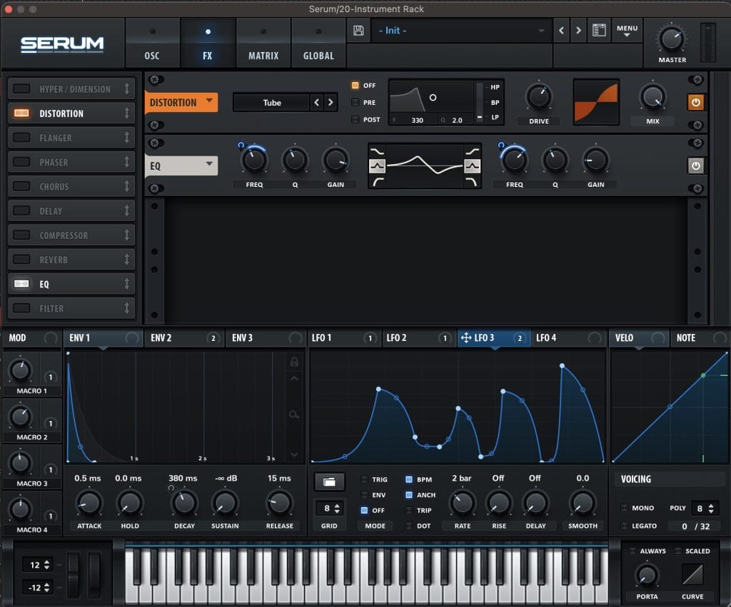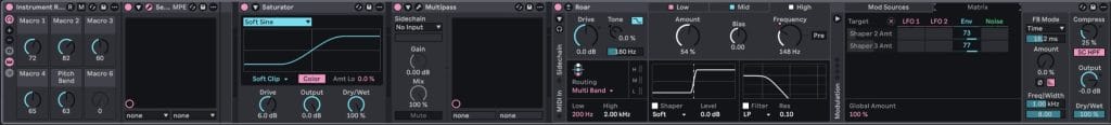 That’s really the basis for this sound, from there just added some tube distortion to hear some of those harmonics come back in. An interesting thing I did after the distortion, still in Serum is adding an EQ with a peak and notch, then automating the frequency knobs with an LFO to give it an ever-evolving sound, that way every time a pluck play it sounds a little different in tonality than the previous note. After reaching that point, I went into post processing, combining some Ableton saturation plugins and Kilohearts multipass. Really all I was doing in the post processing is experimenting with different methods of applying saturation and distortion.