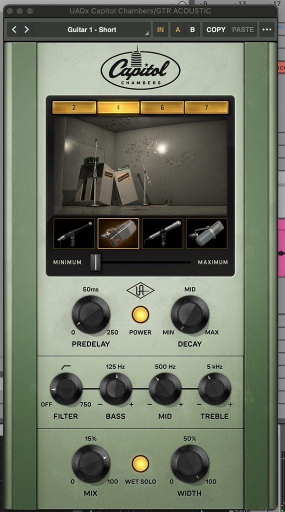 On the GTR bus I’ve added the UAD Captiol Chambers reverb. The reverb plug-in is modelled after one of the most iconic echo chambers in the world that is build years ago under the Capitol Tower in Los Angeles. It’s been used on songs from bands like Muse but also Frank Sinatra and Ray Charles.