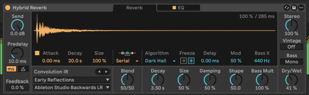 I’m always using Ableton’s Hybrid Reverb on drums and especially horns. The trumpet is the centerpiece of this track and the reverb on that and the drums creates cohesion.