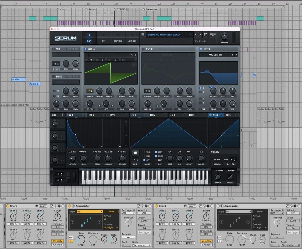 The Serum patch in this track is fairly simple, for the most part it’s just a saw-wave in unison mode running into a filter that has a LFO on the cutoff with automation on the resonance and cut off positions. But, what really creates the sound of the synth in this case, is combining the patch with the use of Ableton’s Chord midi effects both before and after one of Ableton’s Arpeggiator midi effects so that the arpeggiator is receiving a chord on each note played in in our arrangement, and then each note played the arpeggiator is then being turned into a chord afterwards too, which creates a really layered sound. We also automated the arpeggiator gate and filter cut off to create variations on the motif, and also resampled and time stretched parts of the melody with different warp modes to create variations too, which is a technique we like to use a lot in our productions. We also experimented with trying out different waveforms in our Serum patch to create another variation for the second drop, and added a stock Ableton reverb with a high decay and maximum wet signal to create the washy pads on the intro.