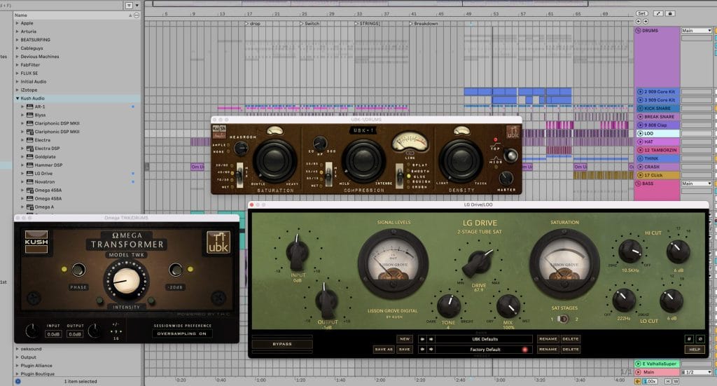 We used a few of the Kush plugins on Burning Hammer,. In particular we used UBK-1 on the track’s drum bus as a glue compressor and LG Drive to add subtle saturation and light eq to soothe the top end of a few individual drum tracks.