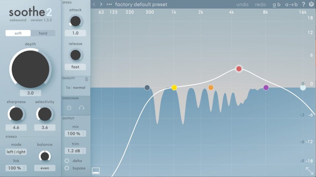 This brings us to the final plugin we want to talk about which is Soothe2 by Oeksound. It’s a plugin that’s used to clean up your sounds, or even multiple sounds when you use it on a bus. Soothe2 basically automatically finds nasty resonances and turns them down. You can adjust the range of frequencies it affects as well with the EQ.