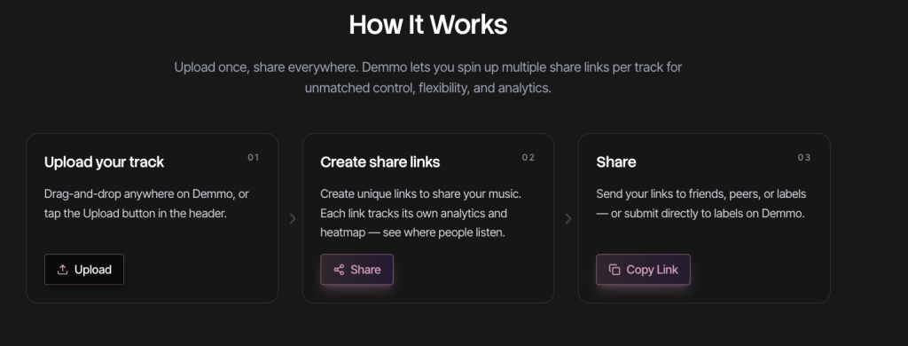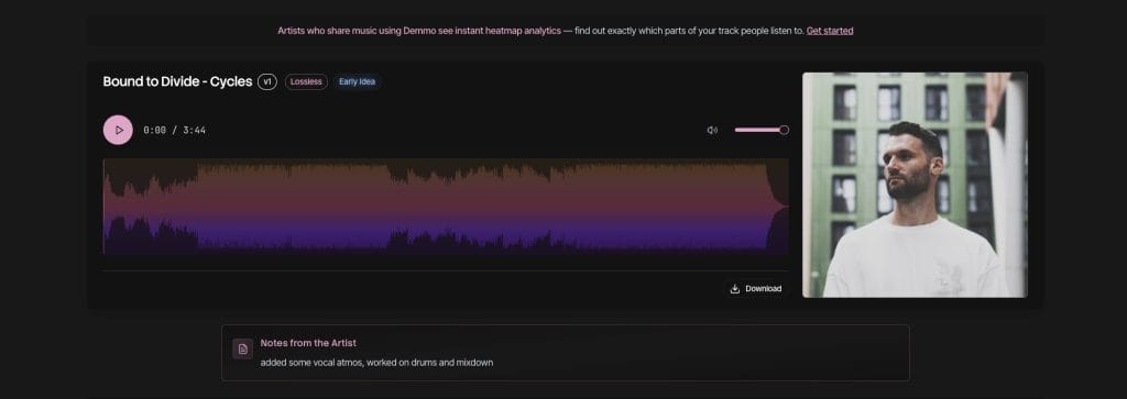 Demmo was built around multiple private links, listening heatmaps, built-in LUFS metering, lossless streaming for WAV, AIFF, and FLAC, Kanban-style project stages, version control, A/B comparisons, and a desktop sync app that automatically uploads files from a folder.