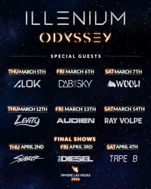 ODYSSEY, ILLENIUM’s sixth studio album, arrives February 6, 2026. The Sphere shows will serve as the exclusive live presentation of the full album, utilizing the venue’s 16K LED display and advanced audio system for an immersive production.