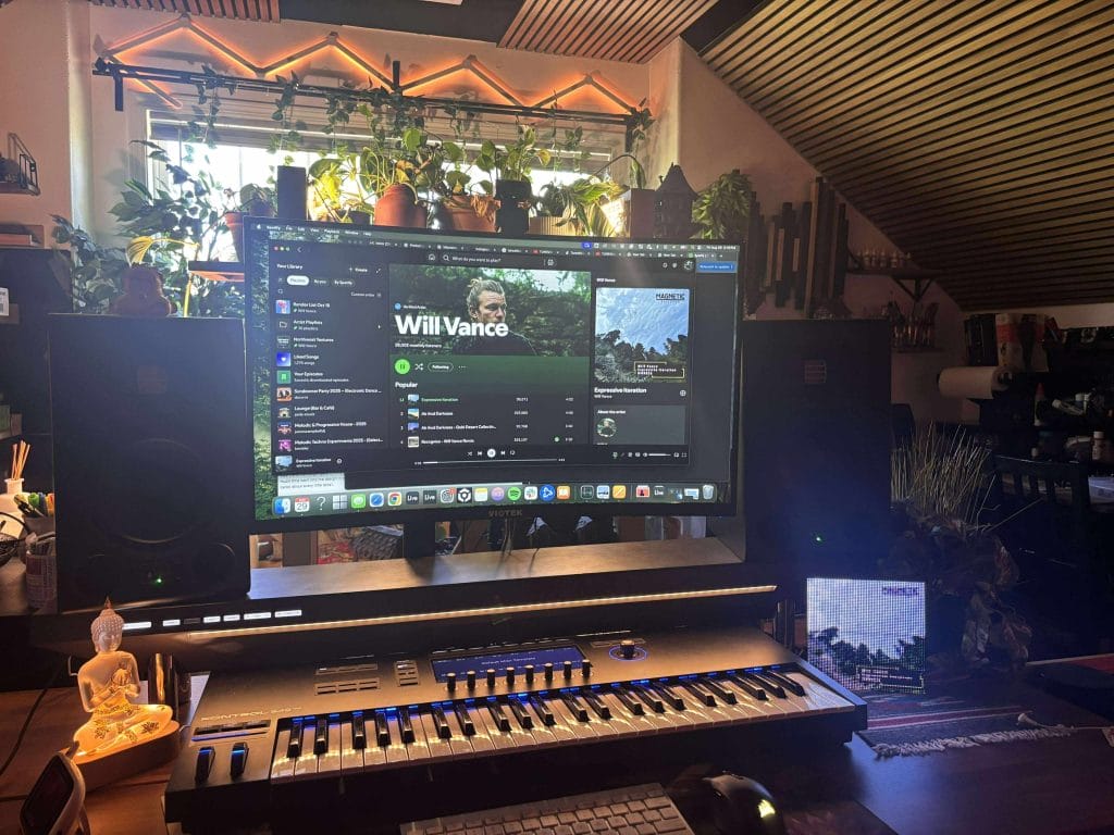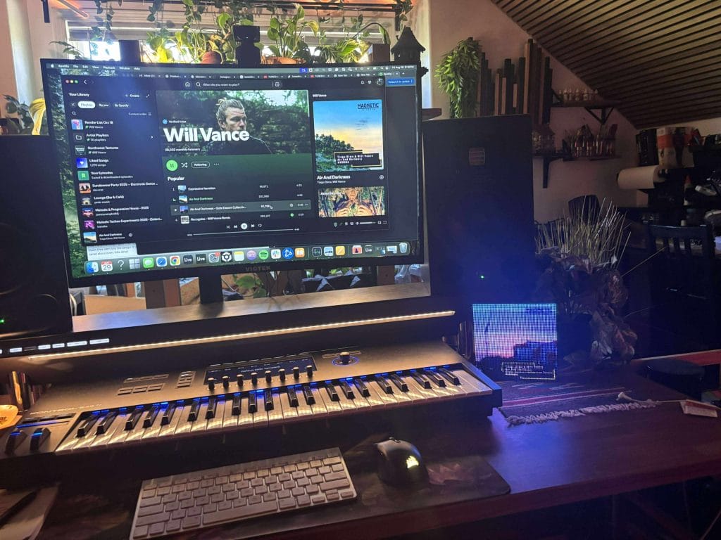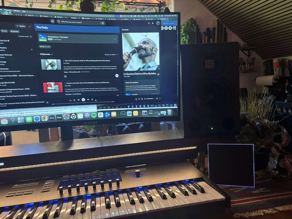 On the desk, Tuneshine looks like it belongs. The size hits the sweet spot — small enough to sit alongside speakers, controllers, or whatever else you’ve got, but large enough that the artwork is visible across the room. Guests have noticed it right away, sometimes before noticing bigger gear in the room. That says something about its presence.
