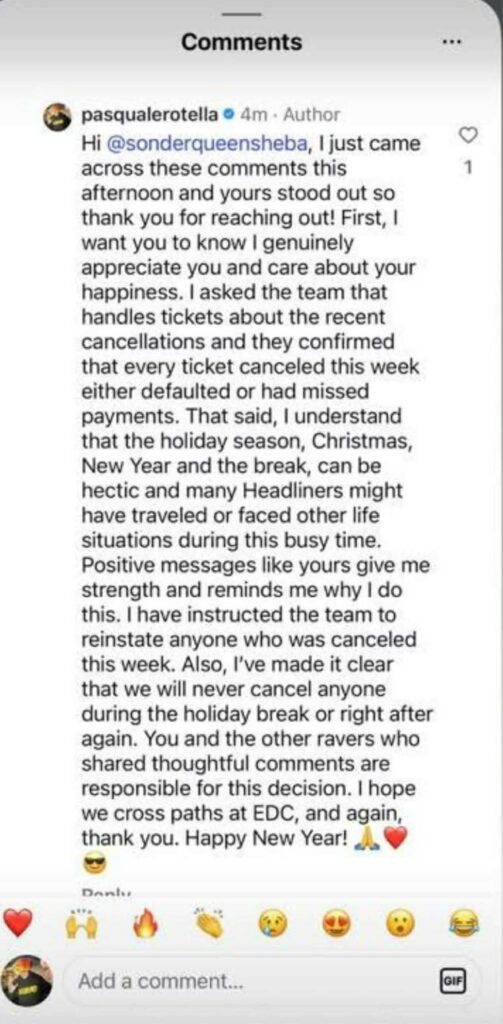 In light of the feedback received, he instructed its ticketing team to reinstate all tickets canceled during this period. He also confirmed a policy adjustment moving forward, explaining that Insomniac will no longer cancel layaway plans during the holiday break or immediately afterward.