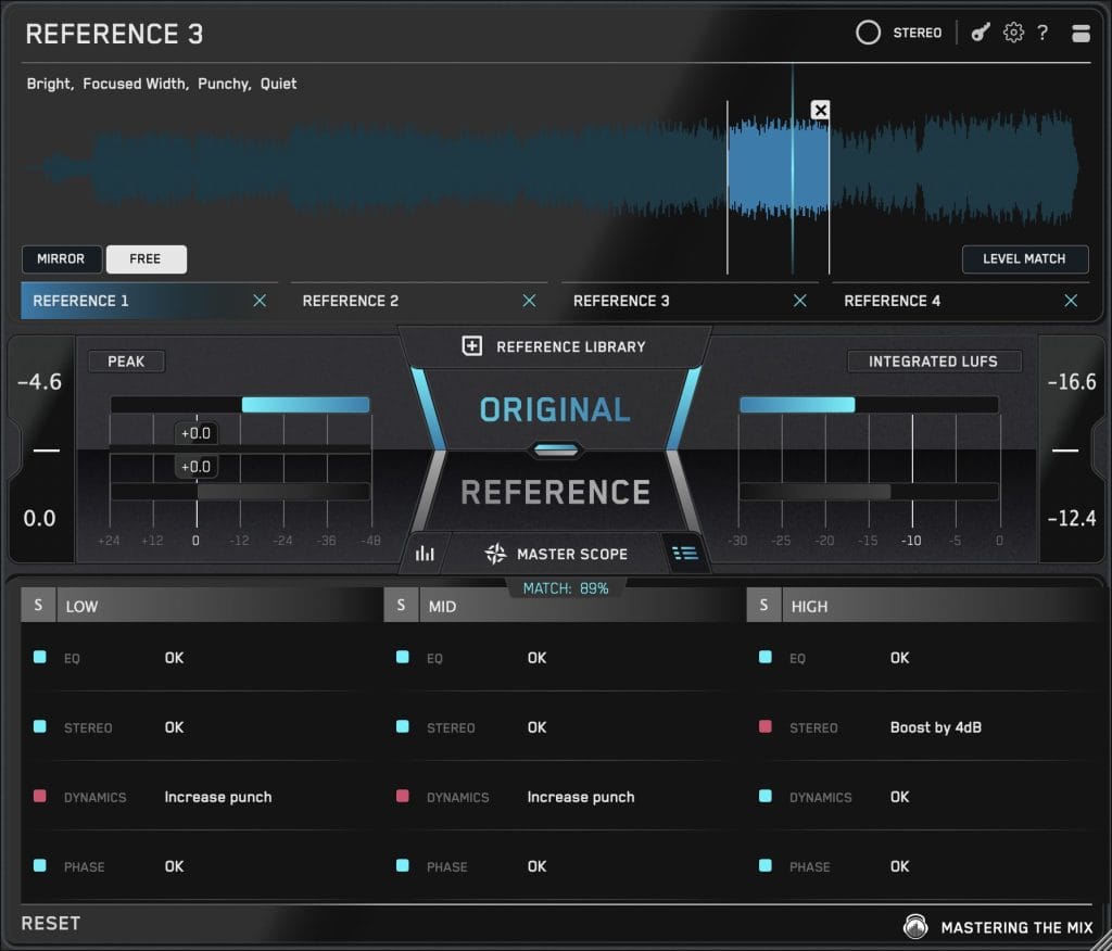 REFERENCE 3 goes beyond mere analysis by offering specific guidance. The Mix Instructor provides written feedback based on the plugin’s analysis, which can be paired with band-solo tools to isolate and address problem areas. Additionally, the Master Scope feature offers precise EQ and stereo adjustments to help you move closer to your reference target.