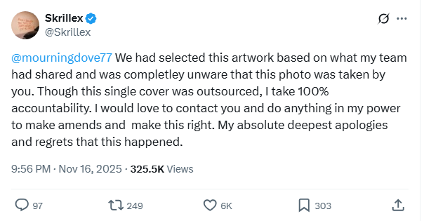 Skrillex responded directly on X early November 17, taking full responsibility despite the artwork being handled externally. “We had selected this artwork based on what my team had shared and was completely unaware that this photo was taken by you,” he wrote. “Though this single cover was outsourced, I take 100% accountability. I would love to contact you and do anything in my power to make amends and make this right. My absolute deepest apologies and regrets that this happened.”